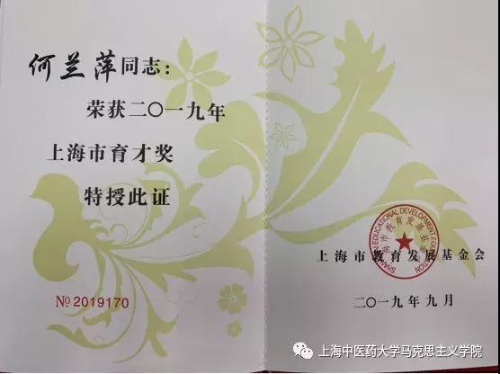公司何兰萍老师荣获2019年“上海市育才奖”